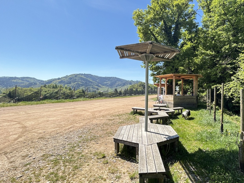 Wetterpilz und Weinautomat wetteifern hier am Rastplatz Bienengarten auf dem Schwarzwälder Genießerpfad und Premiumwanderweg "Durbacher Weinpanorama" um die Gunst des Genießers. Für den Ästheten unter den jenen liegt der Wetterpilz -umgarnt von einer raffinierten Bankanlage - klar vorne in der Gunst, gefolgt von dem gruseligen Pavillon und abgeschlagen am Ende steht der Automat - ein Affront für den echten Wanderer, der seine Verpflegung kilometerlang auf dem Rücken trägt, um sich unter einem Pilz daran zu laben.
